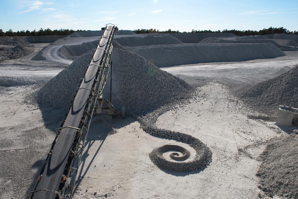 Installation an einer Siebanlage in einem Kalksteinbruch. In der Installation sind alle Kornfraktionen der Anlage verarbeitet.